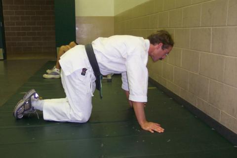Kneel on all fours. Plant the top of your head on the floor. Using your hands