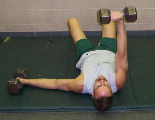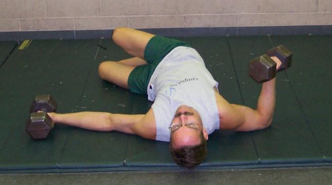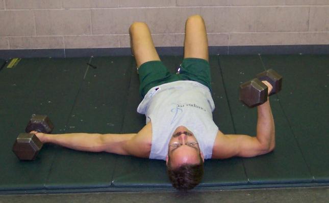 | Lie onthe floor with arm in a "T". Raise one arm so it's at 90 degrees to the floor. |