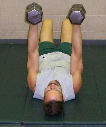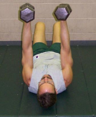 | Lie on your back with two bells in the air, elbows locked. |