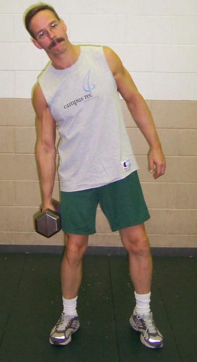 Standing with a single weight, bend to one side then come back to starting position.