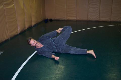 | Knee to chest: Lie on your back. Grab one knee and pull it to your chest, rotating your hips as if you were going to look at your navel. Straighten the other leg, pointing your toes at the wall. | Grab toes: Roll slightly onto one side. Grab the toes of one leg and extend it, pulling the toes back. This gets the hamstrings, glutes, calf and the bottom of the foot. |